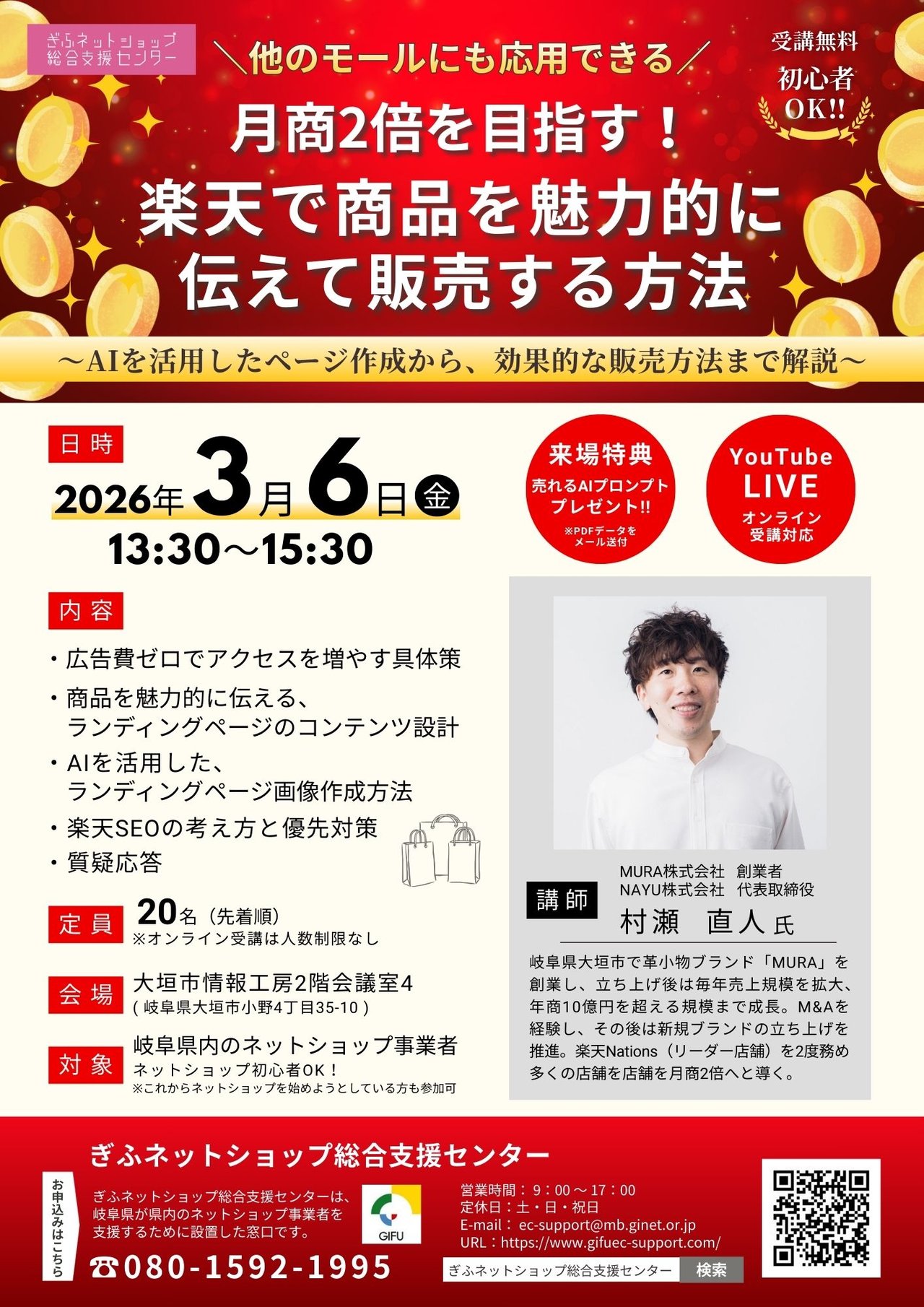 本セミナーでは、楽天市場における売上を向上させるための戦略を総合的に学びます。広告費を抑えながらアクセスを増やす具体的な方法から、商品の魅力を最大限に引き出すページ作成、効果的な販売施策、そして楽天SEOの考え方までを習得し、お客様に「選ばれる」ネットショップ運営を目指します。楽天市場のノウハウは、他モール(Yahoo!ショッピングやAmazon等)にも広く応用可能です。楽天に出店されていない方も、この機会にぜひご活用ください。
