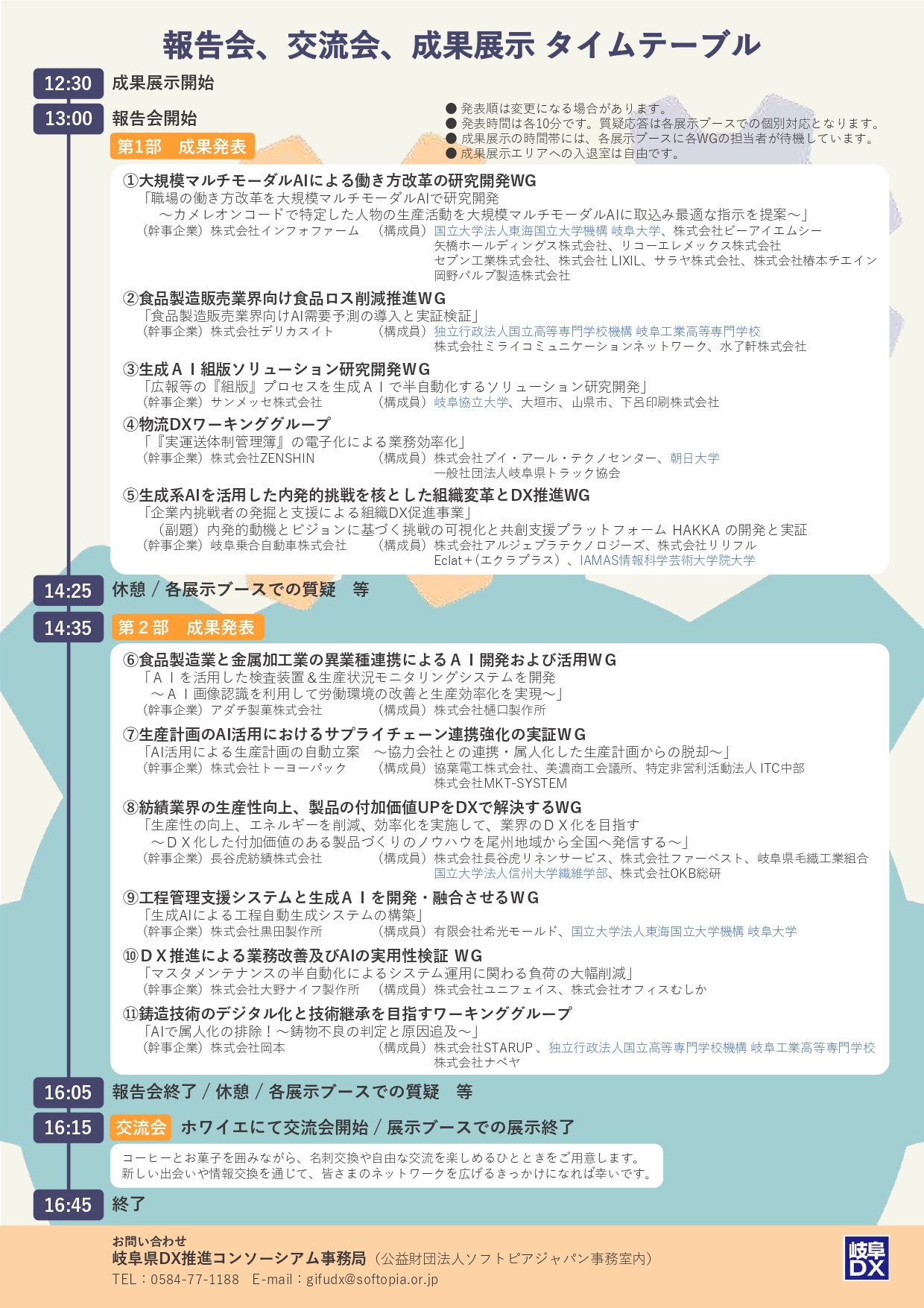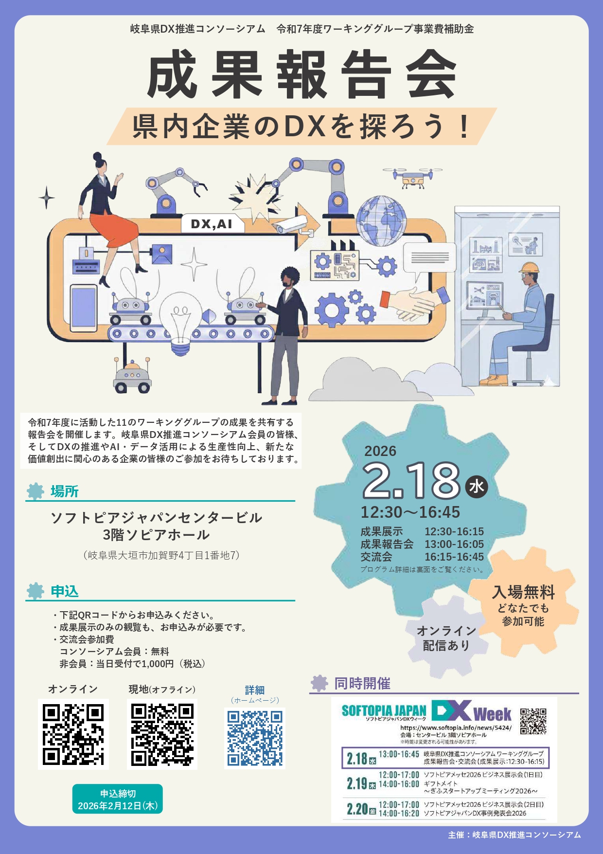 岐阜県DX推進コンソーシアムワーキンググループ成果報告会 令和7年度に活動した11のワーキンググループの成果を共有する報告会を開催します。 岐阜県DX推進コンソーシアム会員の皆様、そしてDXの推進やAI・データ活用による生産性向上、 新たな価値創出に関心のある企業の皆様のご参加をお待ちしております。 詳細はこちら
