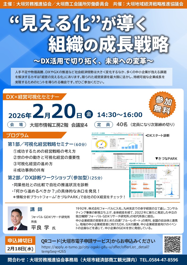 令和7年度 DX×経営可視化セミナー 人手不足や物価高騰、DXやGXの推進など社会経済情勢は大きく変化するなか、多くの中小企業が抱える課題を解決するカギは「経営の見える化」にあります。限られた経営資源を最大限に活かし、持続可能な企業成長を実現するためのヒントを得られる機会です。ぜひご参加ください。 と き:令和8年2月20日(金)14:30~16:00 ところ:大垣市情報工房2階 会議室4 受講料:無料 詳細はこちら